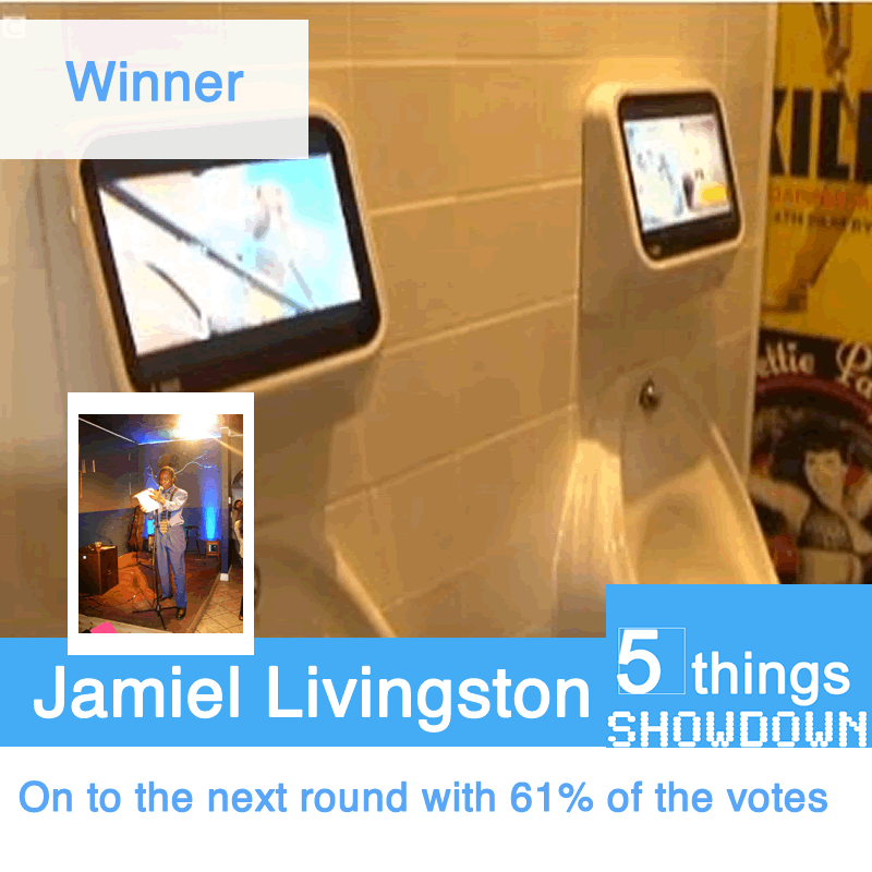 Nick Katranis - Alison on Photography 38%Jamiel Livingston - Public bathroom video games 62%http://5thin.gs/Showdown-Katranis-v-Livingston First Round WINNER: Jamiel Livingston Ryan Nance December 19, 2011